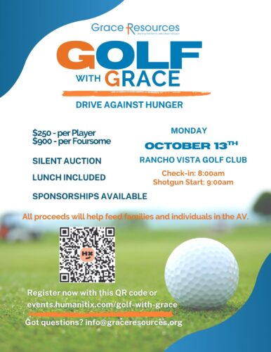 October 13, 2025 @ 8:00 am - 2:00 pm Golf With Grace Rancho Vista Golf Club 3905 Club Rancho Dr., Palmdale Join us for our annual golf fundraising event! Click below to learn more and get involved.