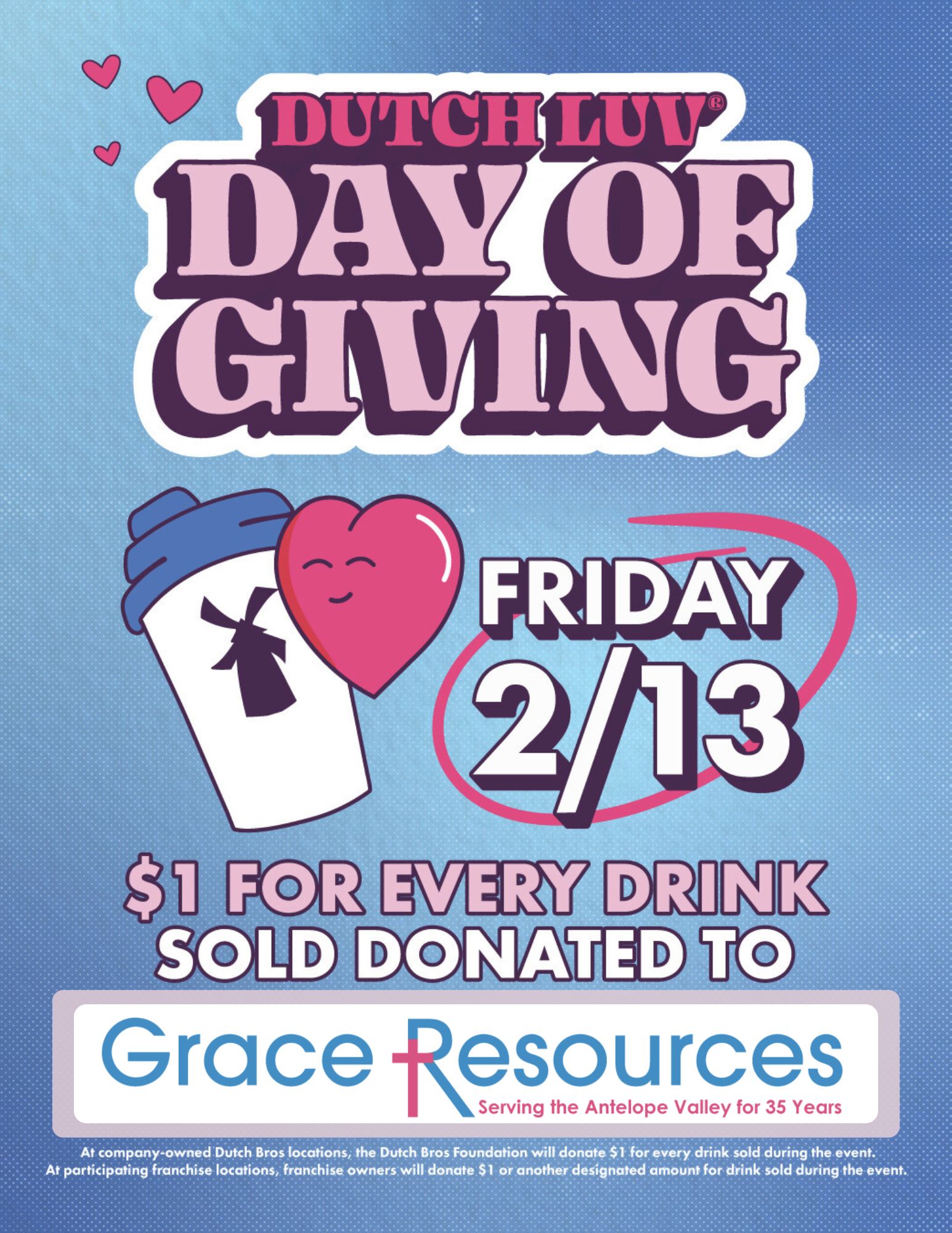 Dutch Luv Day of Giving — Friday, February 13 $1 for every drink sold on February 13 donated by @dutchbroscoffee to Grace Resources. Stop by one of these participating Dutch Bros locations and sip for a cause: 44318 20th St E, Lancaster, CA , 26560 E Palmdale Blvd, Palmdale, CA , 2028 W Ave I, […]